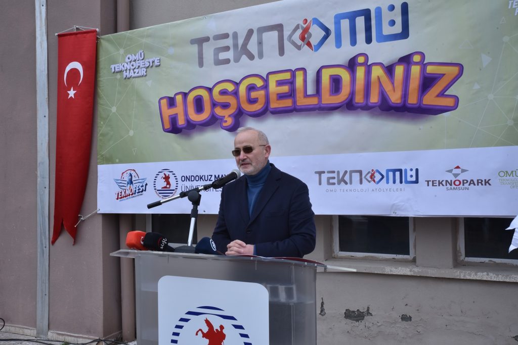 Protokol konuşmalarıyla başlayan açılış şenliğinde ilk olarak söz alan Rektör Prof. Dr. Yavuz Ünal, kazanılan bilginin mutlaka beceri ve teknolojiye dönüştürülmesi gerektiğine işaret ederek “Bizim yönetim anlayışımızda bu sürecin hızlanması için araştırma geliştirmenin (AR-GE) lisans düzeyine indirgenmesi var. Üniversite tercihi yapacak öğrencinin zihninde, kendi geleceği ve yapmak istediklerine ilişkin bir şeylerin şekillenmesi gerekiyor. Öğrenci, hayalindekini gerçeğe dönüştürmeli. Üniversiteye geldiğinde de işte bu şansı ve fırsatı öğrenciye vermek gerekiyor. Bu amaçla gerçekleştirmek istediğimiz zihniyet değişiminin bir ayağı olarak lisans düzeyindeki öğrencilerimiz için ‘Proje Yazma Eğitimi’ adı altında bir hamlede bulunduk. Bu eğitime yaklaşık bin 500 öğrenci başvurdu ve 700 kadarı sertifikalarını aldı. Diğer öğrencilerimizin eğitimi peyderpey devam edecek. Lisans düzeyindeki öğrencilerimizin yaptıkları her projeye 5 bin lira destek vermek suretiyle bu hayallerini hayata geçirmek istedik. ‘Hadi yapın, görelim’ demek yerine beraber çalışmayı tercih ettik. Çünkü OMÜ mezunu, iş hayatında işi diğer kişilerden öğrenen değil de taze kan olarak mensubu olduğu kurumu sırtlanan, motive eden ve ayağa kaldıran birey olarak istihdama katılmalı.” dedi.